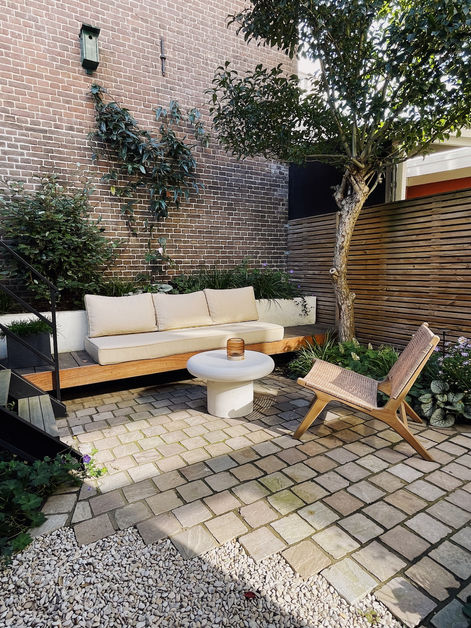 Hierbij werken we het liefst met kwalitatieve en duurzame materialen, omdat een tuin jarenlang mee moet gaan. We combineren graag verschillende structuren, vormen en kleuren met elkaar tot een fraai en speels geheel.